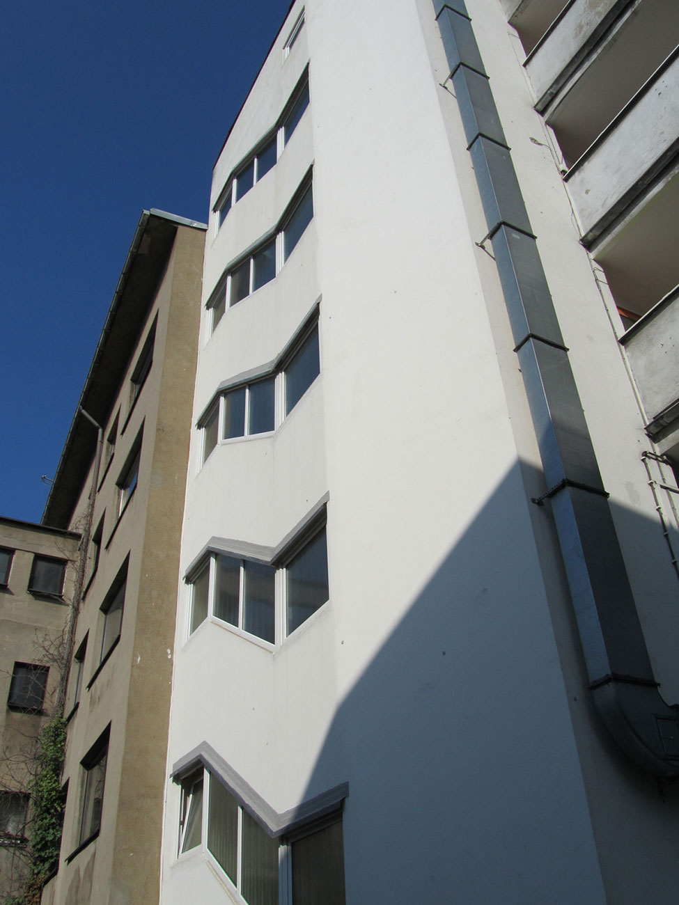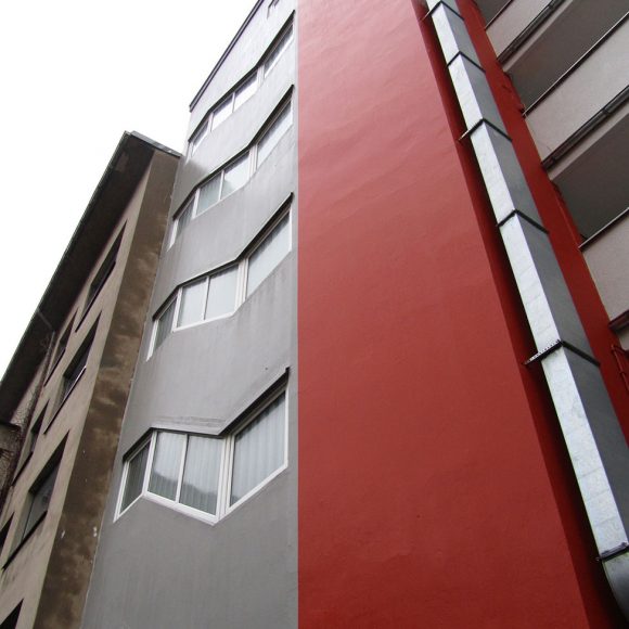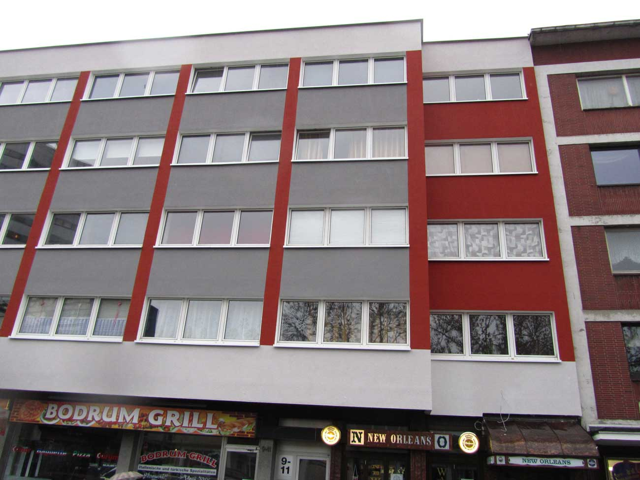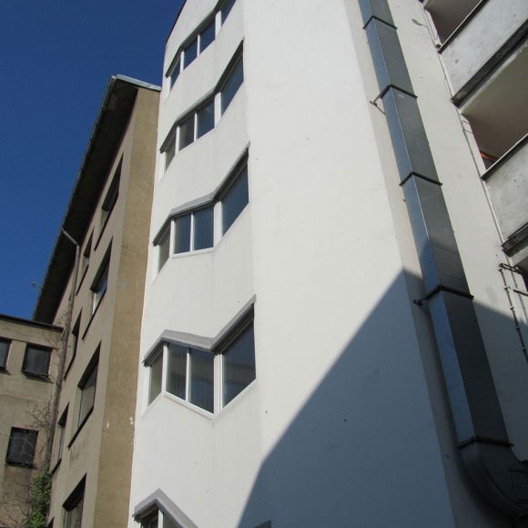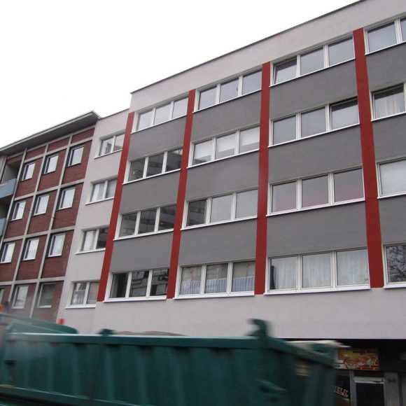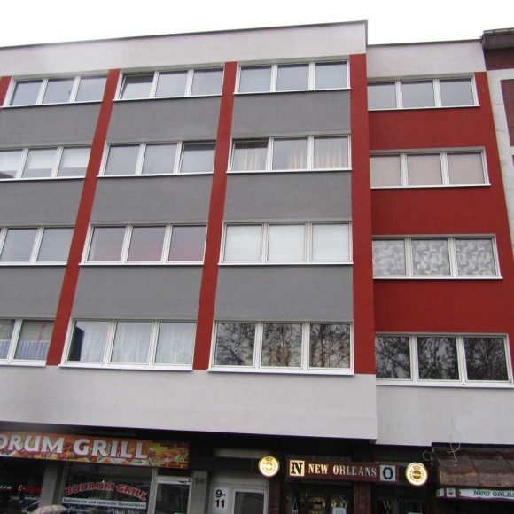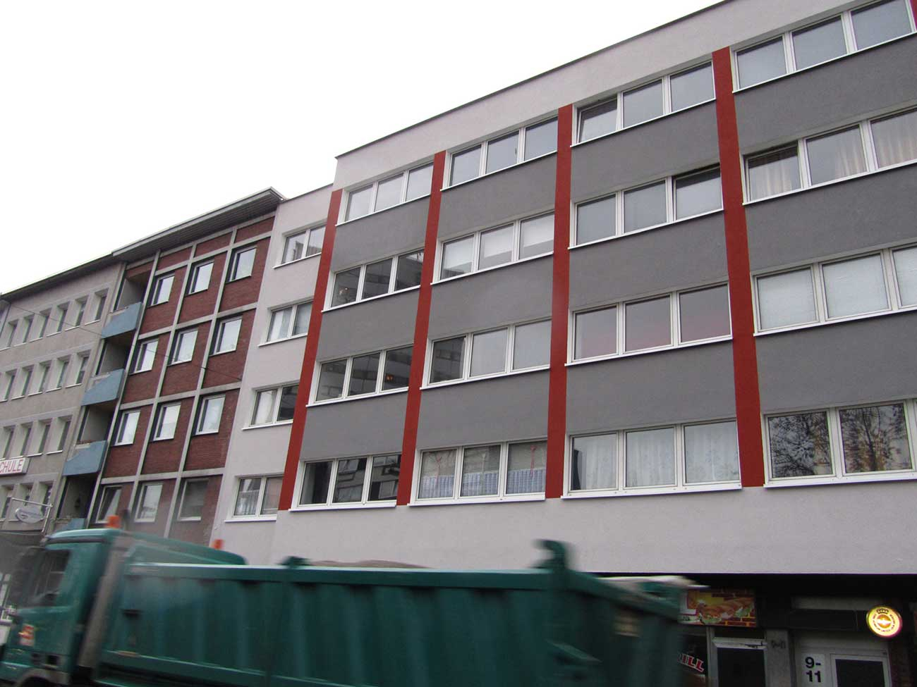 Das Wohn- und Geschäftshaus in zentraler Lage in Bochum wurde energetisch saniert. In dem Gebäude befinden sich vorwiegend Single- bzw. Studentenwohnungen. Fernwärme wurde eingebaut und die Fassade gemäß EnEV gedämmt. Zur optischen Aufwertung des Gebäudes wurde in Abstimmung zur angrenzenden Bebauung ein Farbkonzept erstellt.